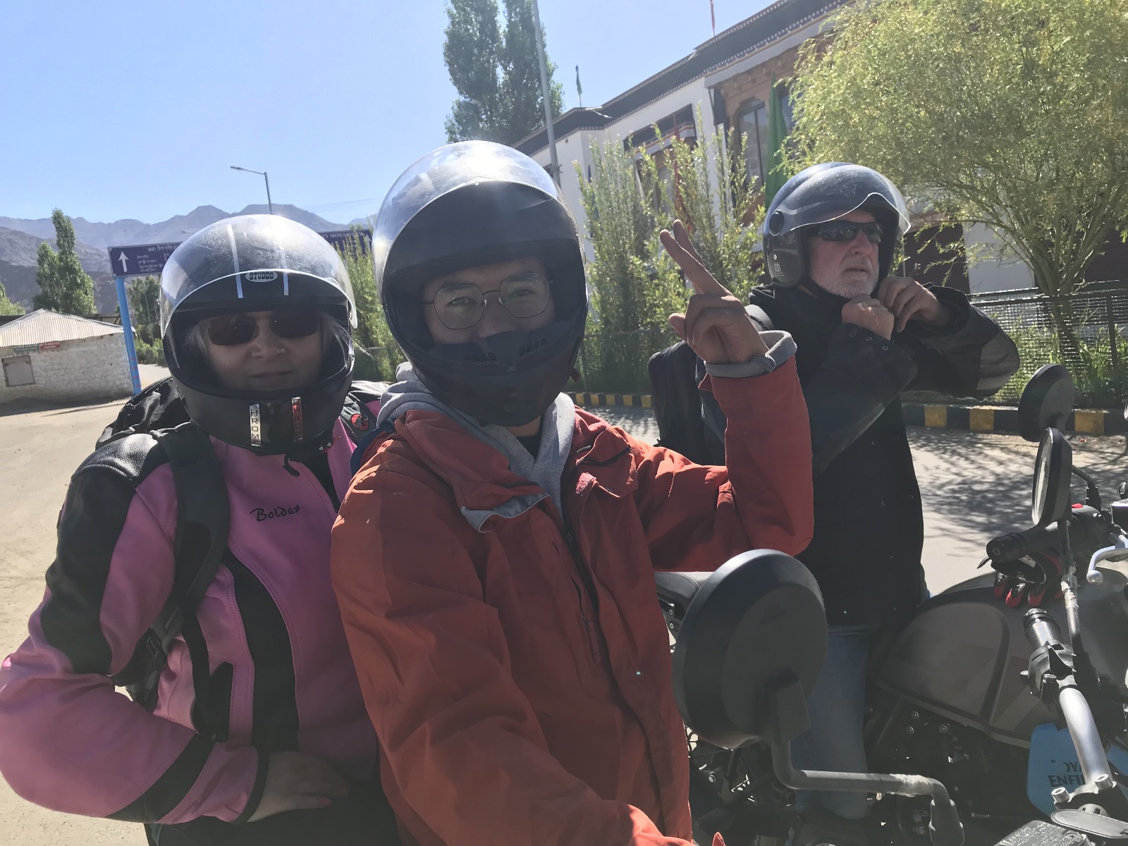 Tenhle výlet si fakt zaslouží víc fotek. Zde se svým řidičem, Tibeťanem, který se dle mého názoru zcela jistě na motorce narodil. Ve své nepostradatelné růžové bundičce. Na vedlejším stroji zkušený jezdec Marian Jelínek.