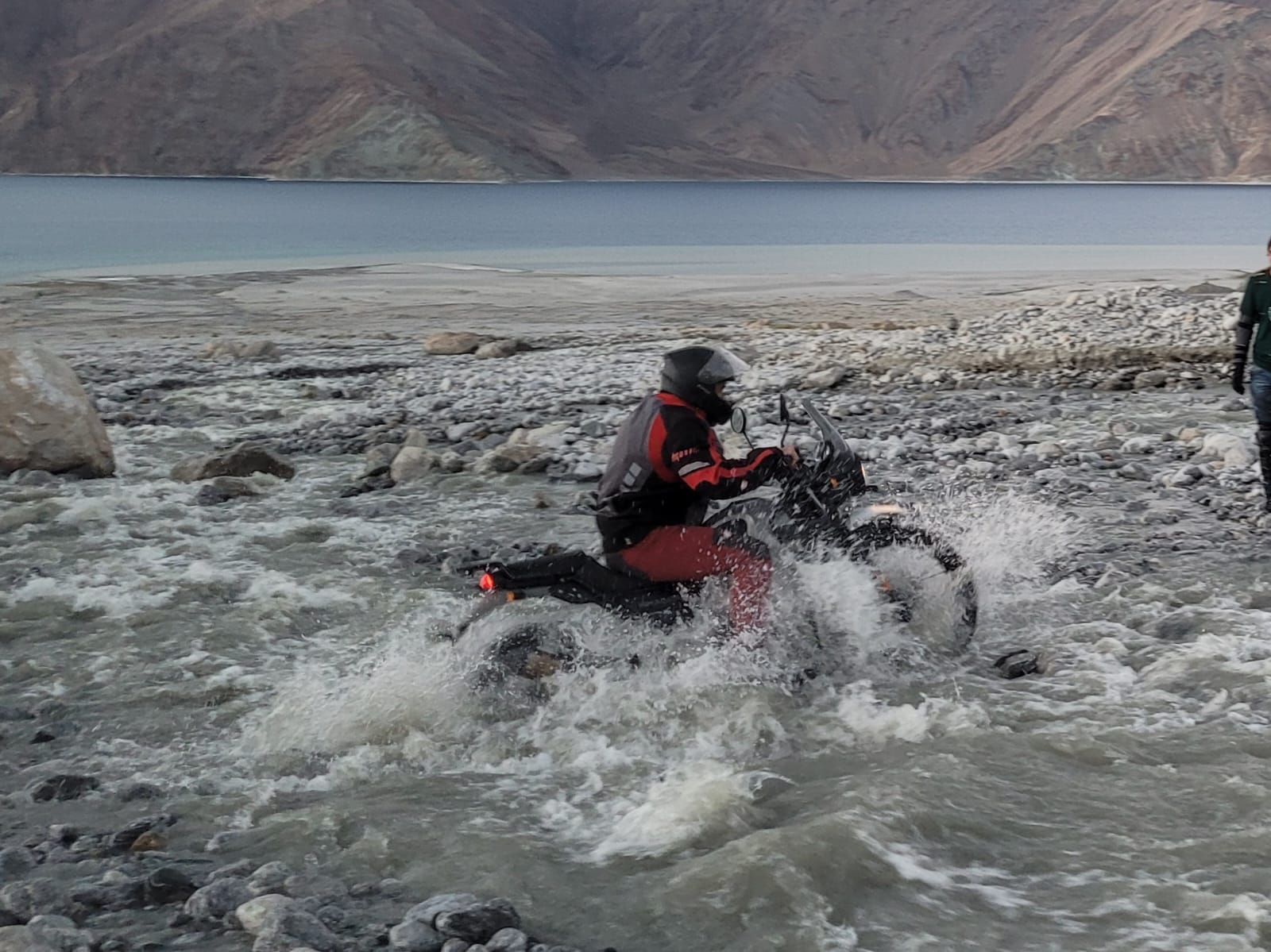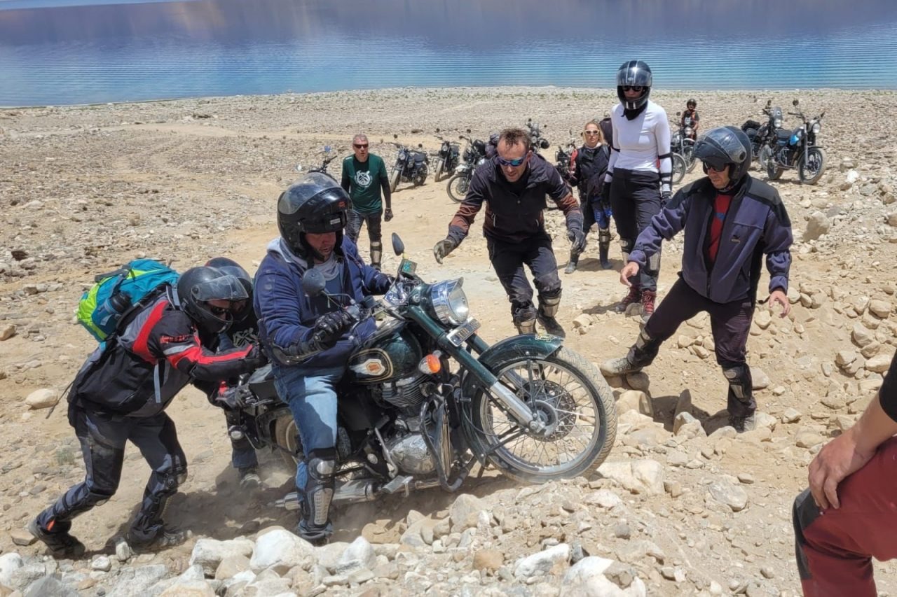 Cesta pod velikánky himalájských štítů vedoucí prakticky až k čínským hranicím byla dechberoucí. A to doslova. Chlapi rvou stroje přes obchvat okolo jezera, protože cesta jaxi… došla...